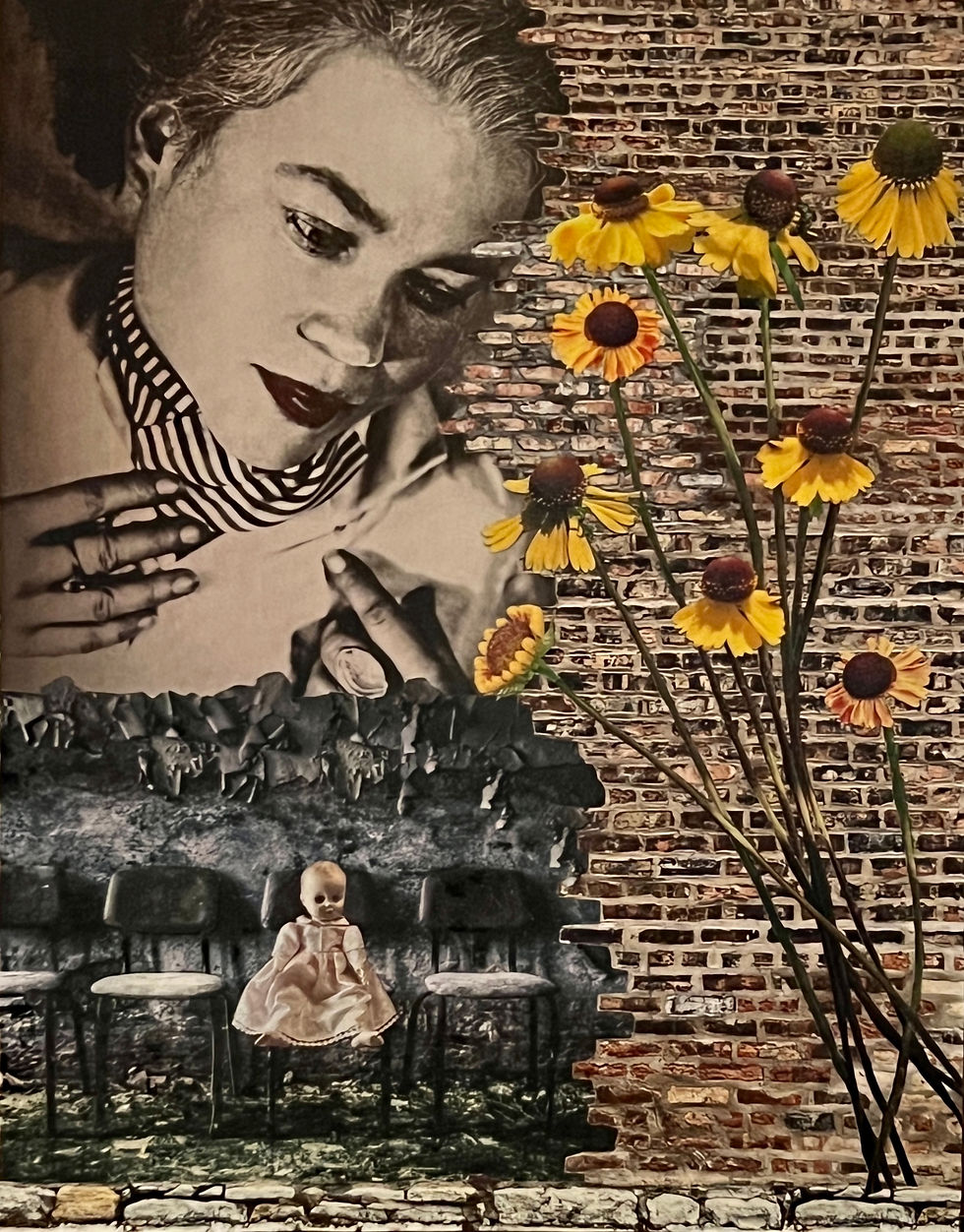 In Kathleen’s collages, she re-configures found images with her own photography to create images that are strongly representational political narratives that both approach the dire need to preserve our precious planet and the environment as well as women’s issues. In addition, Kathleen’s collages seek to connect the viewer with the themes of loss, loneliness, and isolation in a world that has given us myriad ways in which to communicate but has also severely separated us and rendered us unable to voice our truths. Kathleen’s background in poetry and fiction writing inform the metaphorical and narrative aspects of her collages. Her work with traumatized populations, veterans, women in prison, homeless teen mothers, and women seeking to cease allowing past trauma define them influences many of her collages.